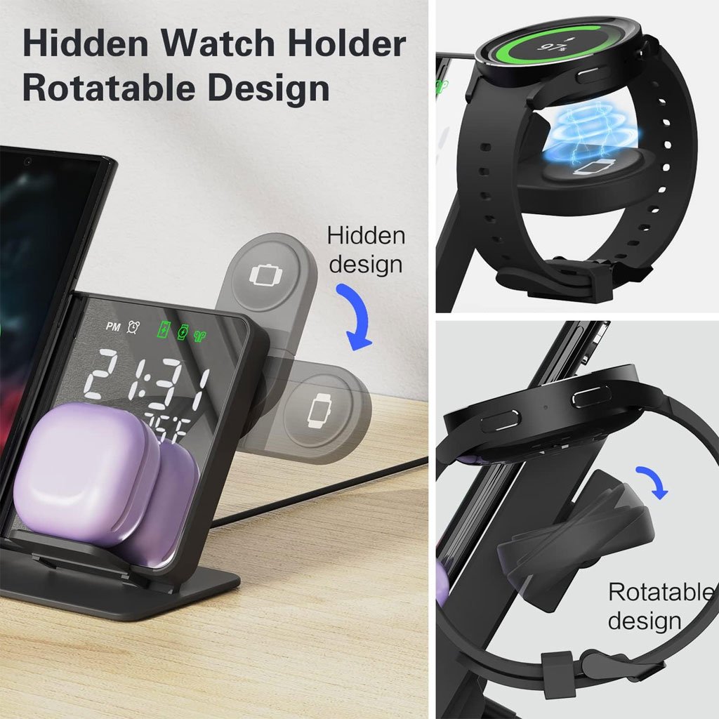 Chargeur sans fil 4 en 1 et station de charge ultra rapide avec Miroir Réveil integré