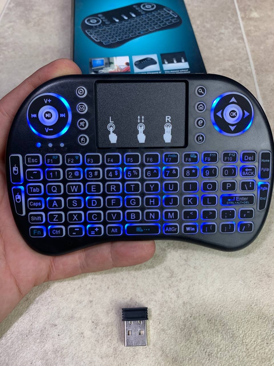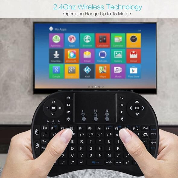 المميزات:يمكن توصيله بجهاز كمبيوتر مكتبي، كمبيوتر محمول، تلفاز السيارة، HTPC، شاشة كبيرة، تلفاز ذكي، مشغل شبكي، جهاز استقبال Android أو X-BOX.لوحة مفاتيح لاسلكية محمولة ومريحة بلمسة وتصميم أنيق.لوحة مفاتيح QWERTY تضم 92 مفتاحاً.تصميم مريح بمظهر أنيق.لوحة لمس أكبر مع زرين لمحاكاة الفأرة.مصنوعة من مواد صديقة للبيئة ومتوافقة مع معايير ROHS.تقنية مطابقة ذكية تمنع فقدان جهاز الاستقبال.مفاتيح تشغيل سريعة لاستخدام أسهل.المواصفات:المادة: بلاستيكنطاق الإرسال: حتى 10 أمتارجهد التشغيل: 3.3 فولتتيار التشغيل: أقل من 50mAتيار الشحن: أقل من 300mAتيار وضع السكون: أقل من 1mAنوع البطارية: ليثيوم قابلة لإعادة الشحننوع الشحن: USBأنظمة التشغيل المتوافقة: Windows 2000/XP/Vista/CE/7/8/10، Linux، Androidنطاق تردد الاستجابة: 2.403GHz ~ 2.480GHzاللون: أسودالأبعاد: 14.68 × 9.75 × 1.9 سممحتويات العبوة:1 × لوحة مفاتيح لاسلكية