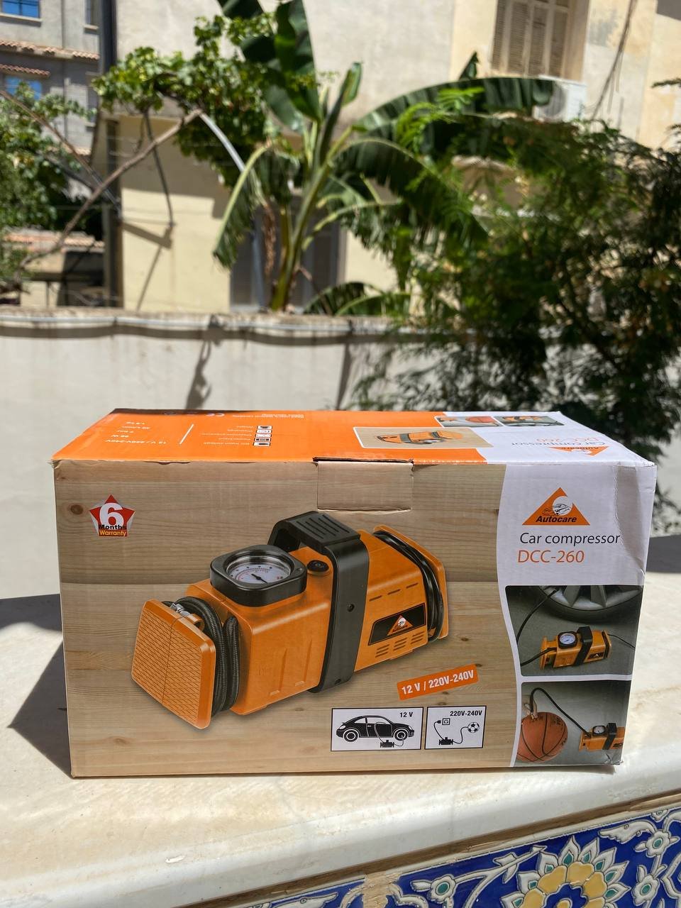 ضاغط هواء للسيارة DCC-260-AC يستخدم لنفخ إطارات السيارات، الكرات، المراتب الهوائية، إطارات الدراجات وغيرها. مزود بمانومتر وقابس لتوصيل ولاعة السيارة 12 فولت ويعمل أيضًا على شبكة 220 فولت. المواصفات:النوع: ضاغط إطاراتالطراز: DCC-260-ACاللون: برتقاليأقصى ضغط: 7 ATمدة العمل المتواصل: 10 دقائقطول أنبوب الهواء: 1.5 ممصدر الطاقة: شبكة 220 فولت أو ولاعة سيارة 12 فولتاستهلاك أقصى: 8 أمبيرطول كابل الطاقة: 2.8 مالأبعاد: 250×105×135 ممالوزن: 1.8 كغمؤشر إنارة للطوارئ: غير متوفر