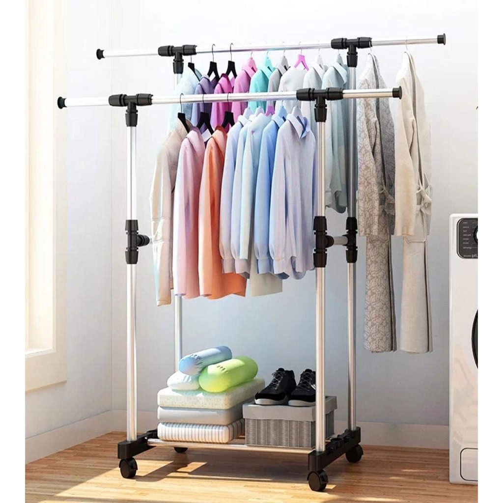 Double Penderie à vêtements portable à roulettes en Acier Inoxydable – علاقة ملابس متنقلة