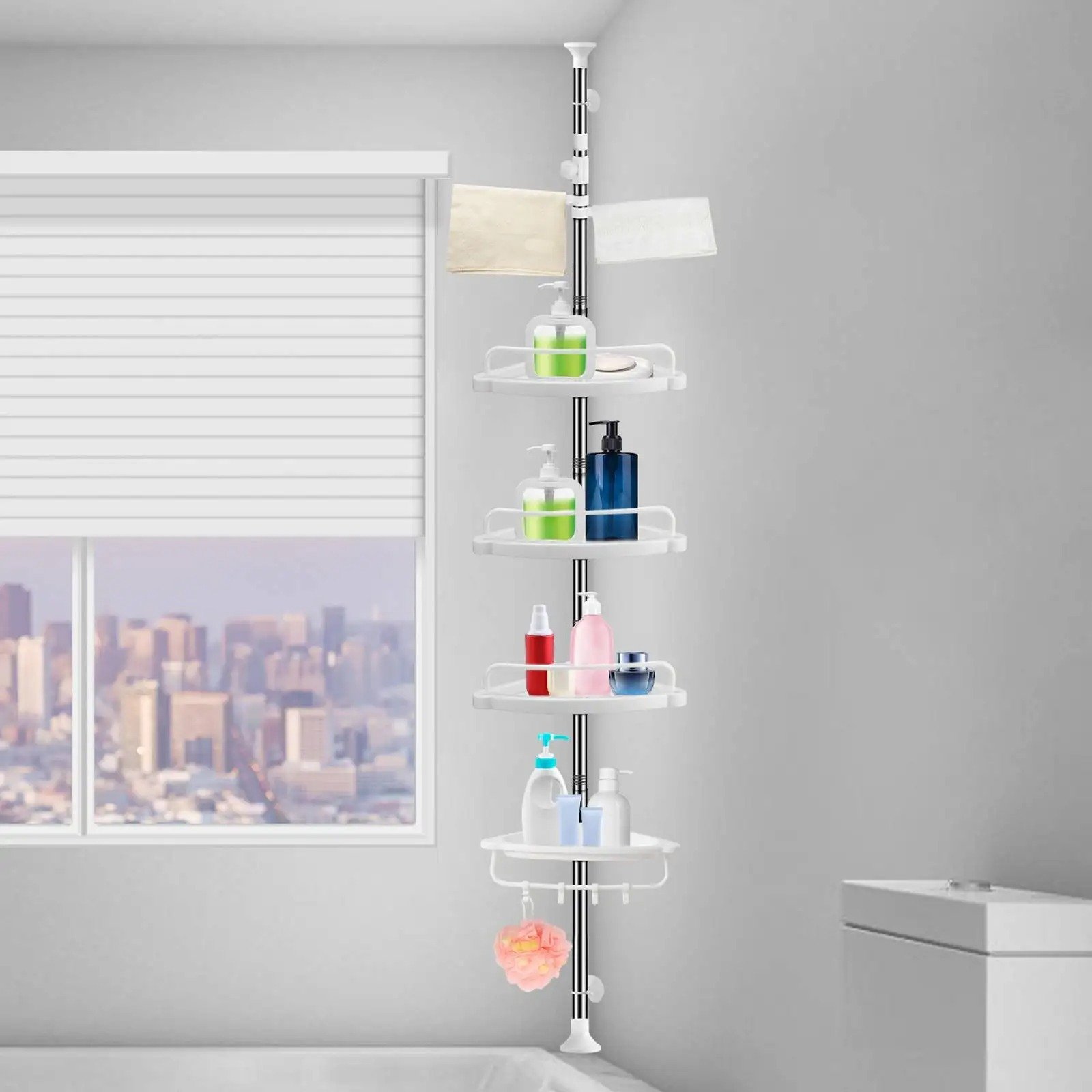 ♥ DURABLE ET GAIN D’ESPACE – Fabriqué en acier inoxydable de qualité supérieure et en plastique ABS, robuste et antirouille. Les étagères renforcées garantissent une capacité portante et une durabilité plus élevées. Fixez-le simplement entre le sol et le plafond et la forme triangulaire s’adapte parfaitement au coin du mur pour économiser plus d’espace, transformez instantanément la salle de bain encombrée en une salle de bain bien rangée et propre.♥ SIMPLE À INSTALLER – Facile et sans effort à assembler. Aucun perçage requis. Poteau réglable en hauteur, fixé entre le sol et le plafond en pleine extension, ou fixé au-dessus du receveur de douche ou de la baignoire en le raccourcissant. Un design innovant et flexible vous permet de l’organiser selon les besoins de votre salle de bain.♥ GRAND STOCKAGE – Les trous de drainage dans les étagères empêchent l’excès d’eau de s’accumuler, réduisant ainsi l’accumulation de moisissures. Le tube télescopique avec 4 étagères réglables peut être placé à n’importe quelle hauteur et offre un grand espace de rangement pour les articles de salle de bain.♥ POLYVALENT AVEC PLUS D’ACCESSOIRES – Un rail de tour réglable peut être tourné à 360° vers n’importe quel endroit, et 4 crochets ainsi qu’une barre de suspension peuvent stocker la boule de bain et le bonnet de douche. Des étagères plus larges et plus profondes, une base stable et solide, le rendent plus sûr et plus fixé.♥ PROPRE – beau, sans endommager le mur, super charge, aspiration incroyable.