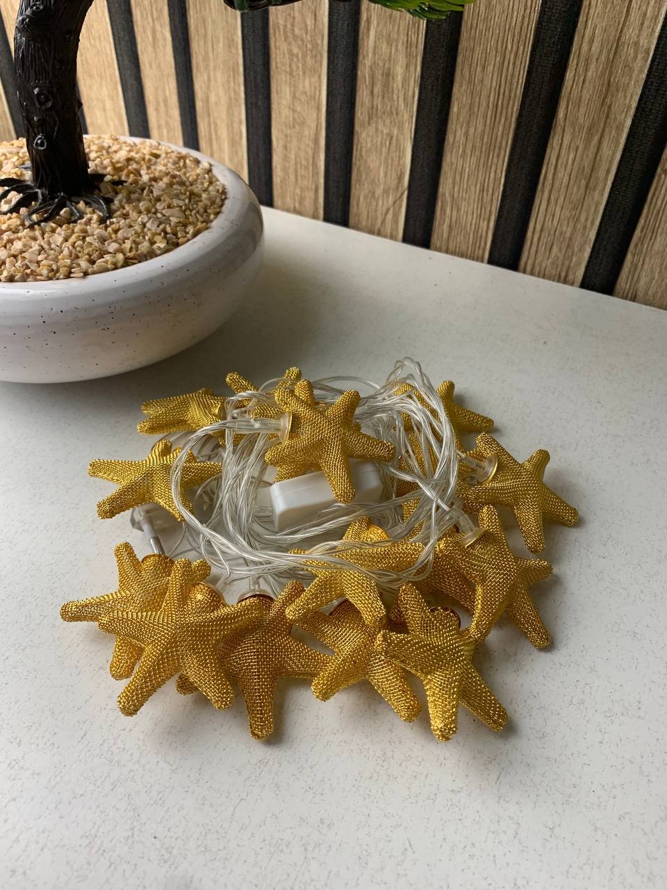 ✨🌟 سلسلة إضاءة نجوم بتصميم ذهبي أنيقتتميّز هذه السلسلة الزخرفية بـ 16 نجمة مغلفة بدقة بشبك معدني ذهبي راقٍ. عند إضاءتها، تنبعث منها إضاءة بيضاء دافئة وناعمة تخلق فورًا أجواءً مريحة وحميمة في أي مساحة.🌟 تصميم حرفي فاخر كل نجمة مزينة بنسيج شبكي ذهبي يعكس الضوء بشكل رائع، وتبقى أنيقة حتى عند إطفائها.💡 إضاءة بيضاء دافئة درجة لون مثالية لخلق أجواء دافئة ومريحة في:غرفة الأطفالغرفة المعيشةالسهرات والمناسبات الخاصة🎉 ديكور متعدد الاستخدامات مثالية لتزيين:خلفية السريرإطار المرآةطاولة المناسبات (رمضان، أعراس، أعياد ميلاد)🔌 سلك شفاف وغير ظاهر الكابل الشفاف يبرز النجوم المضيئة فقط، ليمنحك مظهرًا أنيقًا واحترافيًا.📌 المواصفات التقنية:🔢 عدد المصابيح: 16 نجمة مضيئة🌤 لون الإضاءة: أبيض دافئ🛠 المادة: معدن (شبك ذهبي) + مكونات كهربائية عالية الجودة🏠 الاستخدام: داخلي فقط📏 الطول: 3 أمتار