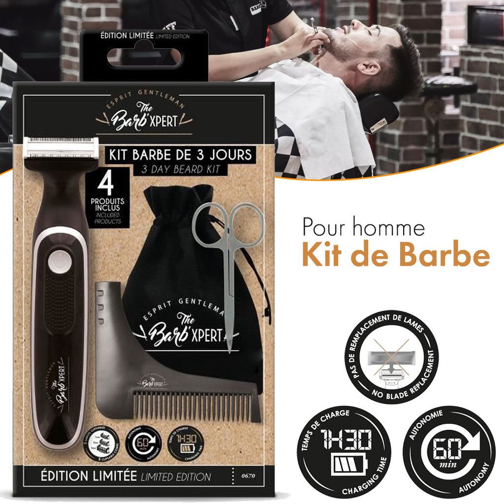 Kit Barbe Tondeuse Hybride, Ciseaux Barbe et Moustache, Peigne Sculptant – Pochette Barb’Xpert