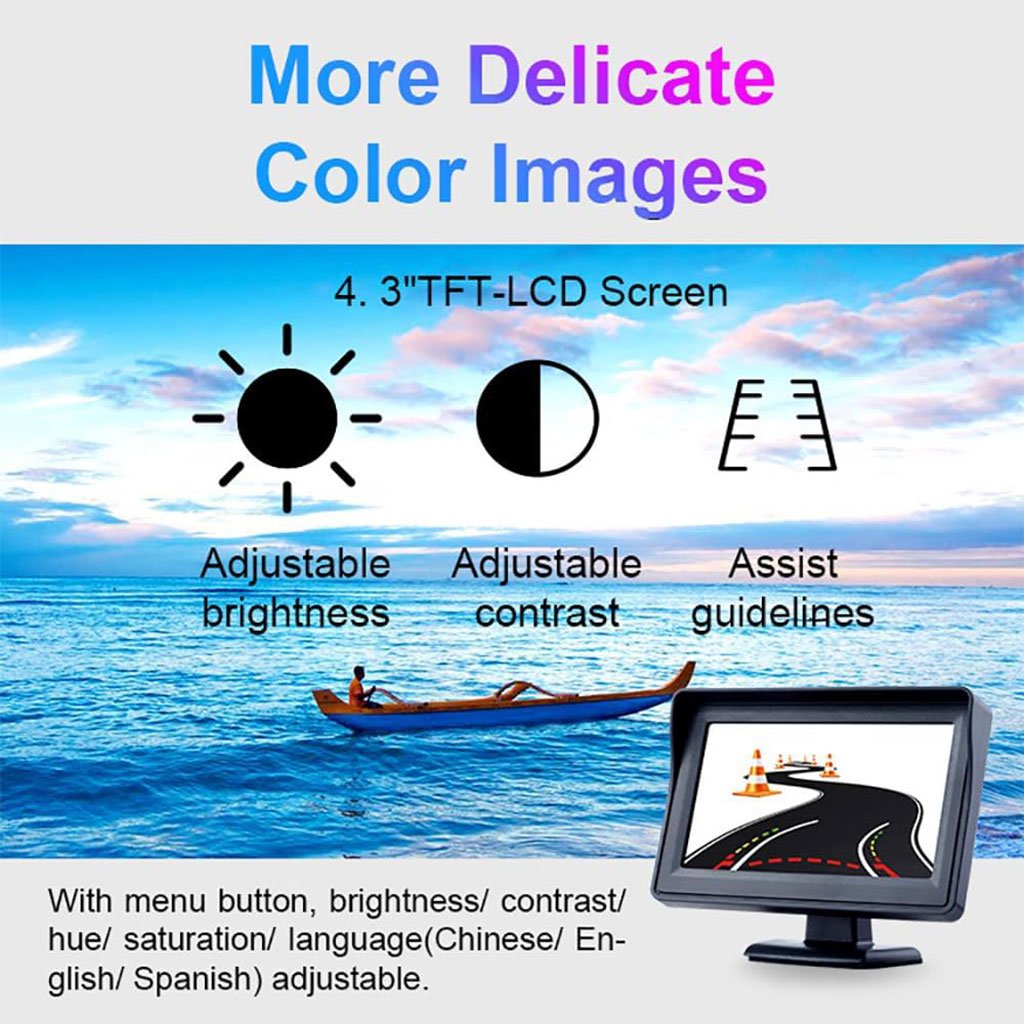 Écran TFT 4,3 pouces pour une image claire et nette, rapport d’affichage: 16:9, résolution de pixels: 480 x 272, chipset universel compatible avec les systèmes vidéo PAL et NTSCMoniteur de voiture avec pare-soleil, peut voir plus clair même par temps ensoleillé, un support avec autocollant adhésif en bas pour le coller dans la voiture, réglable à 180 degrés, zone visible : 72 x 53 mmLe moniteur dispose de deux entrées vidéo V1/V2, V2 a la priorité, donc normalement la caméra de recul est câblée à V2, vous pouvez câbler une autre caméra avant/latérale à V1, lorsque vous conduisez, vous pouvez voir l’avant par V1, lorsque vous allumez et éteignez, le V2 fonctionnera automatiquement sur et hors tensionMoniteur TFT LCD et système de caméra de recul sans fil pour voiture, DVD, VCD, STB, récepteur satellite, la plupart des écrans TFT et autres équipements vidéo. Conseils : retirez le film protecteur lors de l’utilisationMoniteur de voiture avec puce intelligente intégrée qui allume automatiquement l’écran si nécessaire, empêche fortement les accidents pour vous éviter les pertes ou les problèmes inutiles lorsque vous conduisez en marche arrière en évitant les enfants, la circulation, les piétons, les jouets et les animaux domestiques