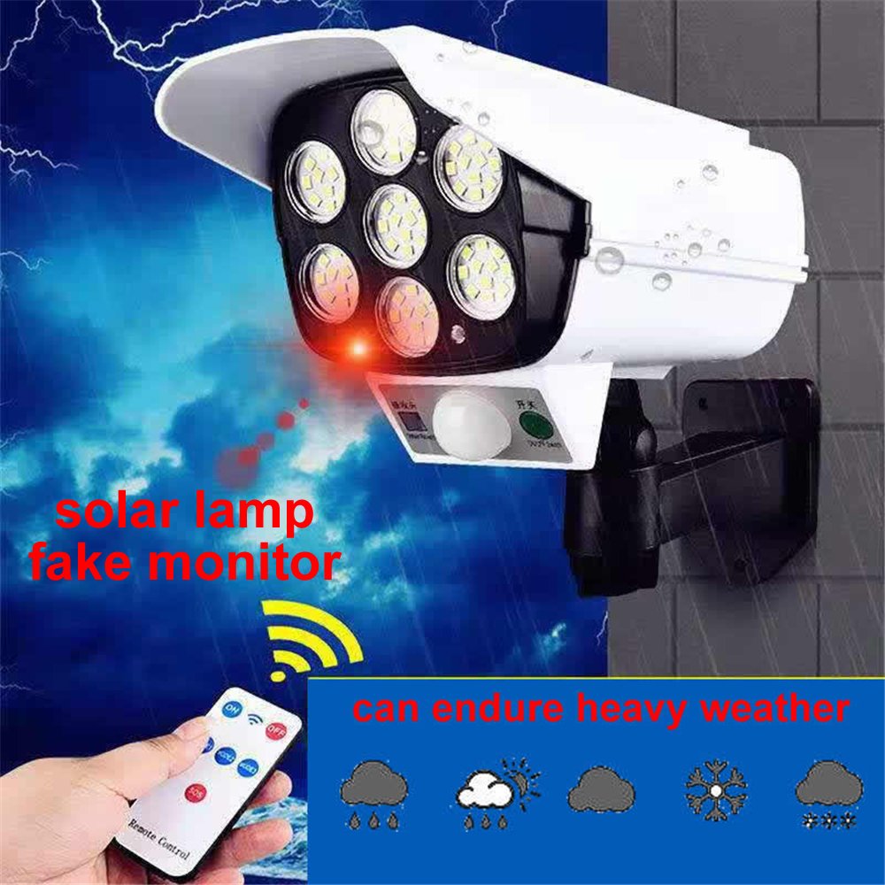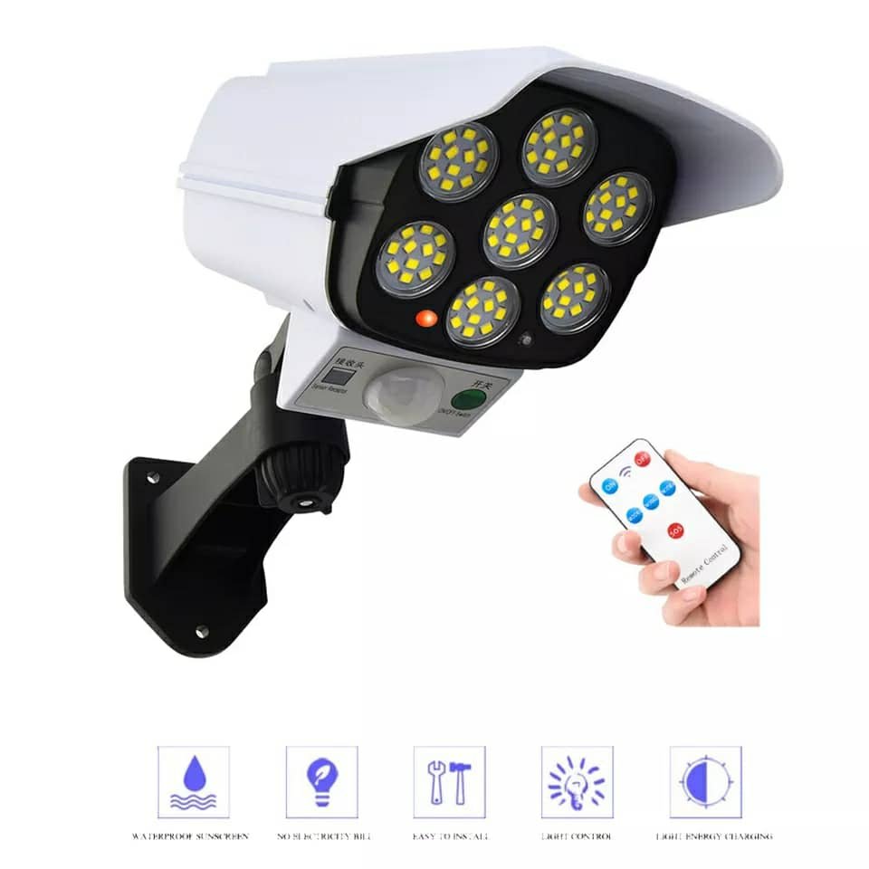يوفر إضاءة فائقة السطوع ليلاً، بالإضافة إلى كونه مجهزًا بحساس حركة. يشبه كاميرا حقيقية ويعمل كوسيلة فعالة للردع وحماية ممتلكاتك. يشحن تلقائيًا بالطاقة الشمسية خلال النهار لتوفير إضاءة ليلية. مقاوم للماء والحرارة ومناسب لجميع الظروف الجوية. سهل التركيب للغاية، يمكن تركيبه في أقل من دقيقة. يحتوي على 77 لمبة LED لإضاءة فائقة السطوع. بطارية طويلة العمر. مزود بثلاثة أوضاع إضاءة. مزود بجهاز تحكم عن بعد. .