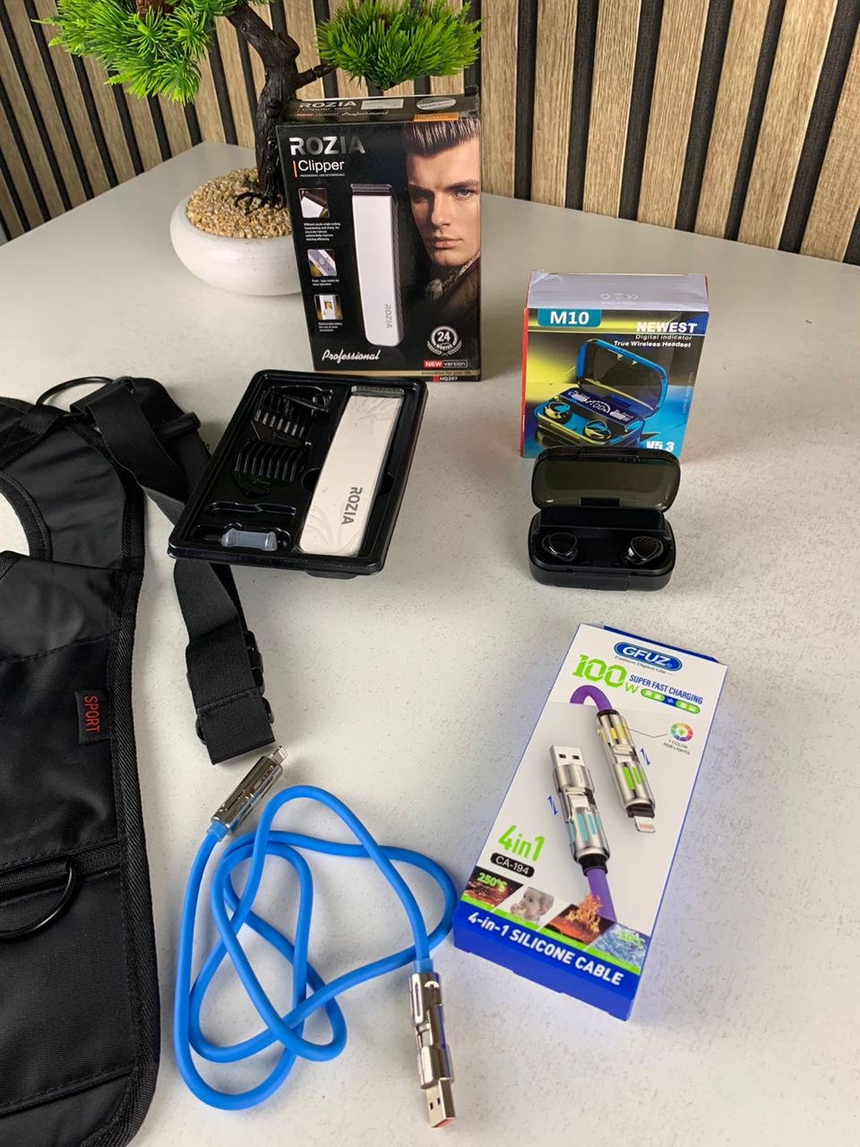 كاين وحد النوع تاع المنتجات لي ماشي غير “كمالية”، بصح تولّي تستعملهم كل يوم بلا ما تحس… وهذا الباك جمعنالك فيه أربع منتجات خفّاف، ستايل، وضروريين لأي راجل يخدم، يسافر، ولا دايماً برا:✔ شاحن متعدد 4 فـ1 لاتهتر راسك بالكابلات ✔ سماعات M10 بخاصية الباوربانك ✔ حقيبة كتف ديزاين مخفية تحمي الأغراض تاعك ✔ ماكينة حلاقة ROZIA للشعر واللحيةباك واحد = راحة + تنظيم + ستايل + اقتصاد!📌 وش كاين داخل الباك ؟🎧 سماعات M10 البلوتوث + باورنباكصوت ستيريو قويبطارية تدوم بالساعاتتصميم خفيف للموتور، الخدمة، والسبورالكيس يخدم باورنباك تشارج بيه تليفونك➡ حل مثالي للي دايماً برا ومحتاج موسيقى واتصالات بدون مشاكل.🔌 كابل شحن 4 في 1 – 240Wتشحن به كل الأجهزة (Type-C / iPhone / USB)سرعة شحن عاليةواحد يكفي مكان 4 كابلات➡ ما تسحقش تحمل كابلات بزاف… واحد ويريّحك.🎒 Sac bandoulière مخفي مضاد للسرقةيتخبّى تحت الذراعآمن للموتور، النقل العام، والخدمةديزاين أنيق وخفيف➡ حافظ على الهاتف، المال، والوثائق بدون ما يكون باين.✂ Tondeuse ROZIA للشعر واللحيةبطارية قوية + شارجي USBرأس دقيق للحلاقة والرتوشمناسبة للسفر والاستعمال اليومي➡ ديما منضّم وأنيق بلا صالون.💡 علاش هذا الباك ؟لأنك كامل اليوم برا وتحتاج أدوات تعيش بيهالأنك تحب تكون ستايل ومنظّملأن شراء كل منتج وحدو يكلّف أكثروهذا الباك يوفر عليك المال + يعطيك قيمة مضافة في حياتك اليومية.