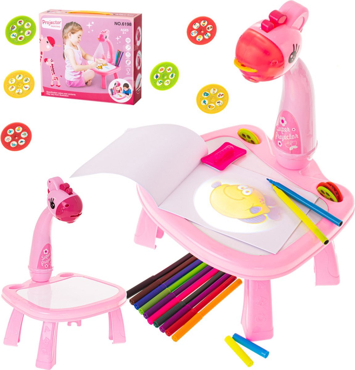 بروجكتور أطفال بتصميم زرافة للرسم والتلوينألوان مشرقة ودافئة تجذب الطفل لساعات من اللعب الإبداعييعمل بثلاث بطاريات AA (غير مشمولة)يتضمن 6 شرائح بعدسات إسقاط تحتوي على 36 صورة مختلفةيمكن الرسم مباشرة على طاولة البروجكتور ومسح الصور بالإسفنجة المرفقةيحسّن مهارة اليد والأصابع ويعزز الخيال والإبداعيمكن عرض الرسومات النهائية على ورق خارجي أو تعليقها كديكورالمحتويات:طاولة مزودة ببروجكتور6 شرائح عرضإسفنجةدفتر رسم12 قلم تلوينمادة الصنع: بلاستيكالعمر المناسب: 3 سنوات فأكثرالأبعاد: 25×21×35 سم (ارتفاع المنصة 13 سم)